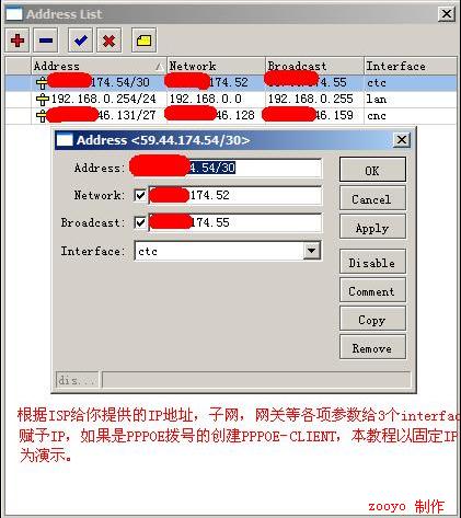 依次点击ip/address, 按“+”号,在interface中选择公网接口Wan,输入公网地址,广播地址等信息,然后apply,接着OK就行了。其他的上网方式请上网找资料进行设置)。